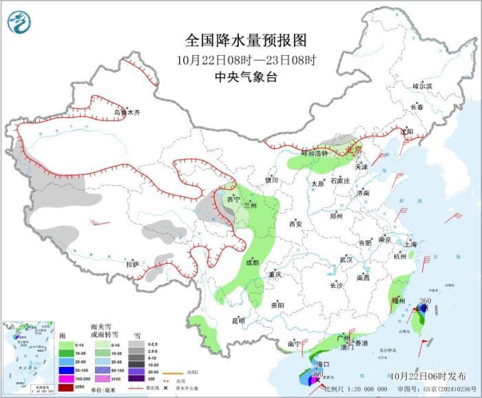 10月22日8时至23日8时,新疆南疆盆地和西部山区、西藏西部和东部、青海东部和南部、甘肃西南部、河北北部等地部分地区有小到中雪或雨夹雪;海南岛、台湾岛北部、广东雷州半岛等地部分地区有大到暴雨,其中,海南岛东南部、台湾岛北部等地部分地区有大暴雨,局地特大暴雨(250~260毫米)。新疆北部和东部、西藏中北部、青海西南部、甘肃西部、辽东半岛、山东半岛、福建东部、广东南部、广西南部、海南岛等地部分地区有5~6级风,阵风7~8级;黄海南部海域、东海北部海域、北部湾、琼州海峡将有7~8级、阵风9~10级的大风,东海南部海域、台湾海峡、台湾以东洋面、巴士海峡、南海北部和中西部海域将有8~10级、阵风11~12级的大风。