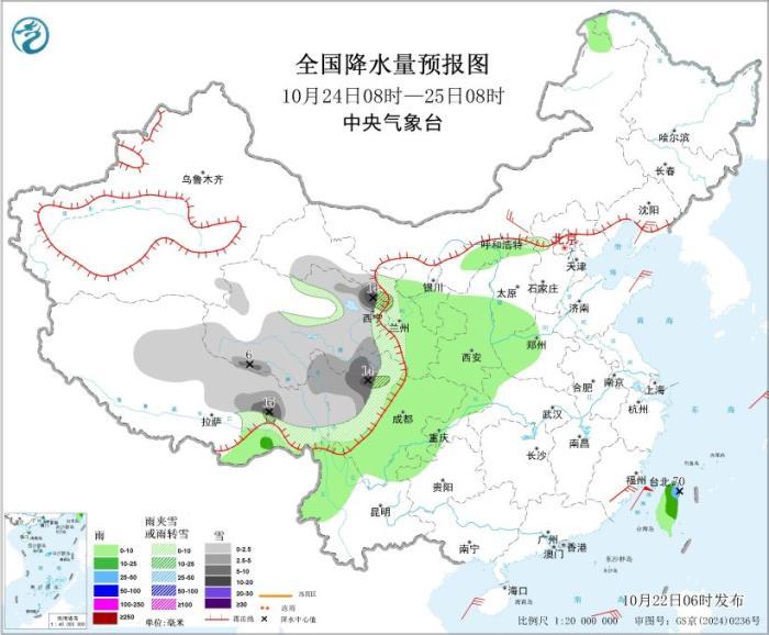 10月24日8时至25日8时,西藏东部、青海东部和南部、甘肃南部、川西高原北部等地部分地区有中到大雪,局地暴雪(10~15毫米);内蒙古河套地区、西藏东部和南部、西北地区东部、华北南部、黄淮西部、西南地区东部、台湾岛等地部分地区有小雨,其中,台湾岛北部和东部等地部分地区有中到大雨,局地暴雨(50~70毫米)。内蒙古中部、辽东半岛、山东半岛、福建东南部等地部分地区有4~5级风;台湾海峡将有8~9级、阵风10级的大风,东海南部海域、南海东北部海域将有7~8级、阵风9级的大风。
