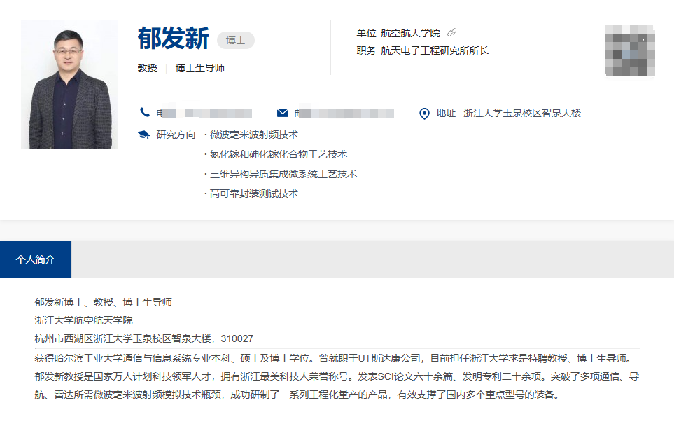 公开资料显示,1975年出生的郁发新,从2006年1月至今,还担任浙江大学航空航天学院教授。