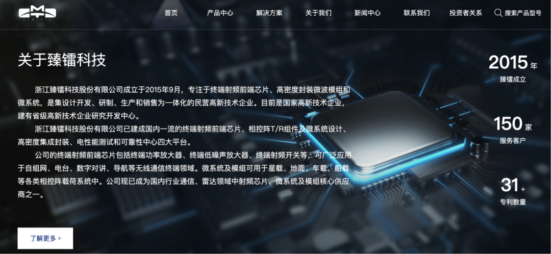 据公司官网消息,臻镭科技成立于2015年9月,专注于终端射频前端芯片、高密度封装微波模组和微系统,是集设计开发、研制、生产和销售为一体化的民营高新技术企业。目前是国家高新技术企业,建有省级高新技术企业研究开发中心。